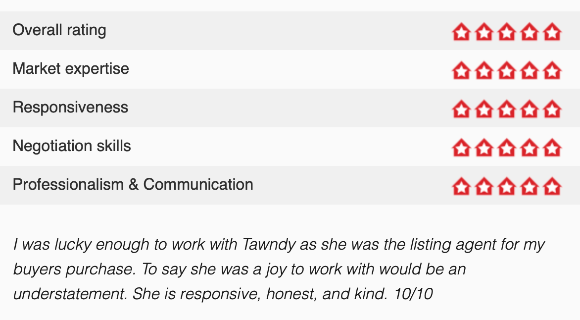 I was lucky enough to work with Tawndy as she was the listing agent for my buyers purchase. To say she was a joy to work with would be an understatement. She is responsive, honest, and kind. 10/10